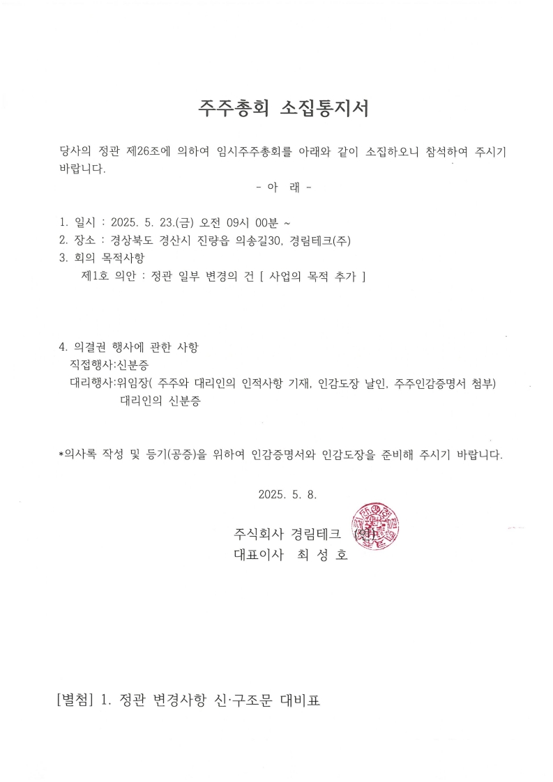경림테크(주) 임시주주총회를 아래와 같이 공고합니다.